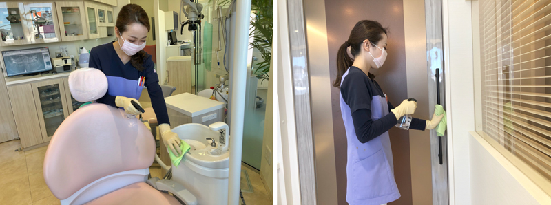 診療室では、診療台や操作パネル等を消毒液による清拭を行っています。